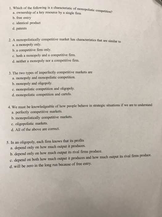 All of the following are characteristics of monopolistic competition except that. A is less elastic than the monopolists demand curve. Easy entry many firms and differentiated products The demand curve faced by a monopolistically competitive firm is more elastic than the monopolists demand curve In monopolistic competition which of the following would make an individual firms.