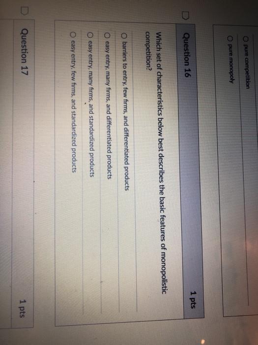 A barriers to entry few firms and differentiated products. Easy entry many firms and standardized products Barriers to entry few firms and differentiated products Easy entry many firms and differentiated products Easy entry few firms and standardized products.