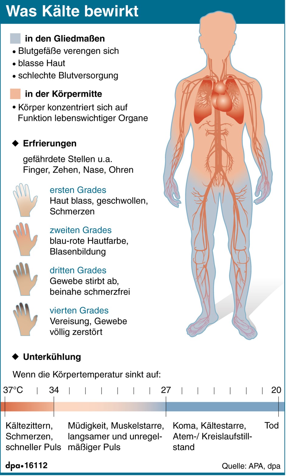 Erfrierungen teilt man in drei Schwere- oder Tiefengrade ein. Geläufig ist heute auch die Einteilung nach der Tiefe und der Art der Blasen klar oder blutig. Entfernen Sie nasse kalte Kleidung und wickeln Sie den Patienten in warme Rettungs-Decken.